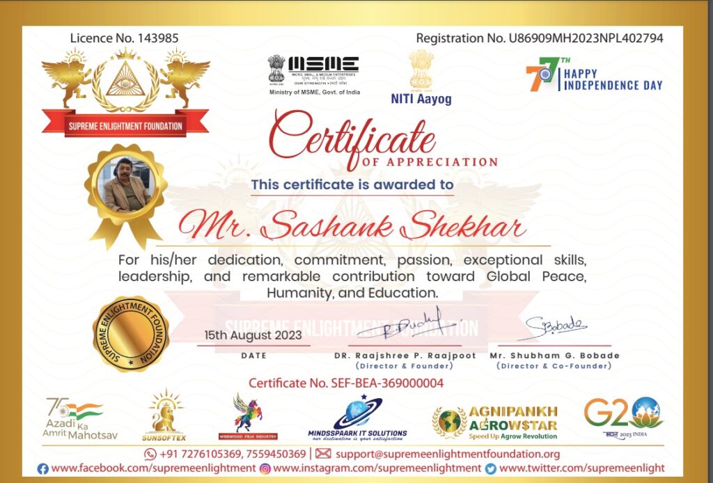 We are honored to receive the Supreme Enlightenment Foundation Award for Global Peace, Humanity and Education. This recognition underscores our commitment to advancing education, fostering humanitarian values, and promoting peace and understanding across communities. We remain dedicated to leveraging our work for positive global impact.